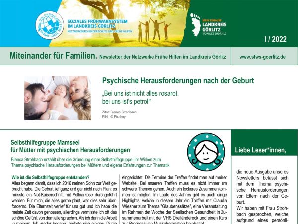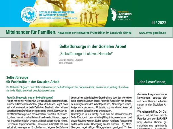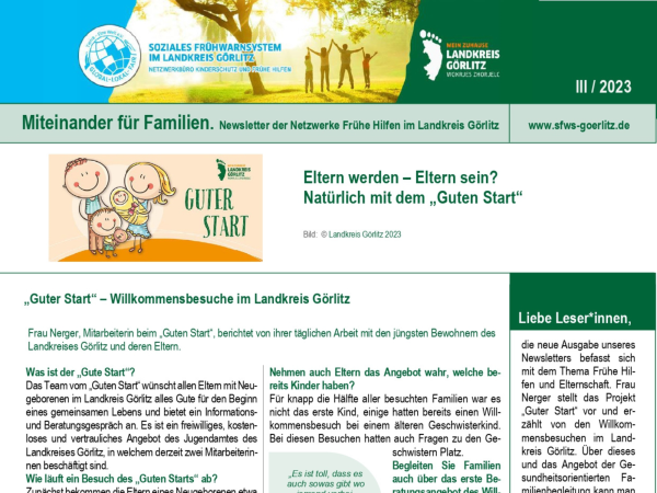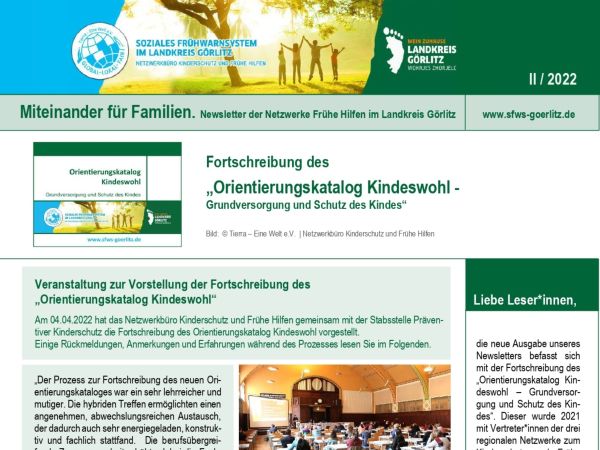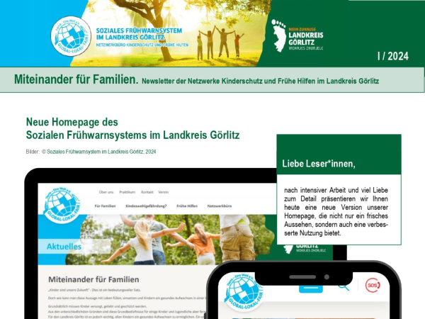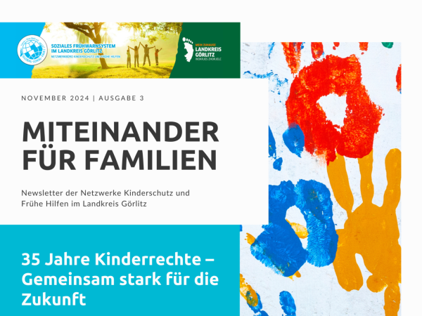Miteinander für Familien – das ist nicht nur der Name des Newsletters sondern gleichermaßen Leitspruch und Anspruch für die präventive Arbeit mit Familien im Landkreis Görlitz. Die Fachkräfte und ehrenamtlich Engagierten erhalten mit dem Newsletter gebündelt aktuelle und für die Arbeit im Landkreis relevante Informationen zu Frühen Hilfen, Familienbildung sowie Kinderschutz. Gleichzeitig soll damit die Vernetzung gefördert und darauf aufmerksam gemacht werden, dass wir MITEINANDER mehr FÜR FAMILIEN erreichen können.