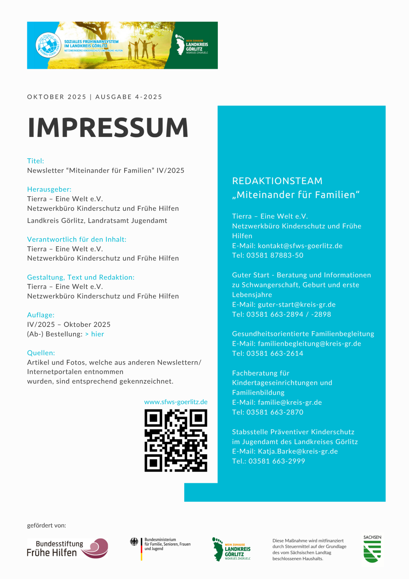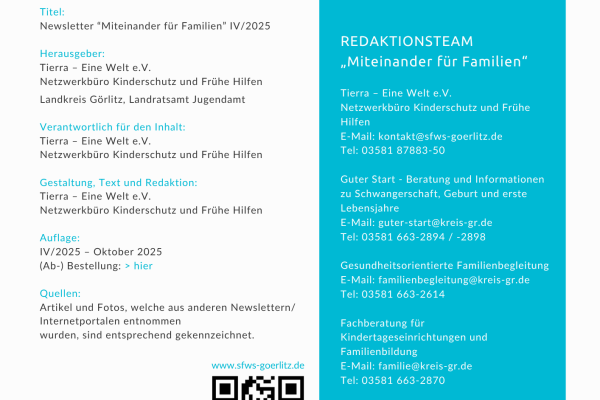 Miteinander für Familien – das ist nicht nur der Name des Newsletters sondern gleichermaßen Leitspruch und Anspruch für die präventive Arbeit mit Familien im Landkreis Görlitz. Die Fachkräfte und ehrenamtlich Engagierten erhalten mit dem Newsletter gebündelt aktuelle und für die Arbeit im Landkreis relevante Informationen zu Frühen Hilfen, Familienbildung sowie Kinderschutz. Gleichzeitig soll damit die Vernetzung gefördert und darauf aufmerksam gemacht werden, dass wir MITEINANDER mehr FÜR FAMILIEN erreichen können.