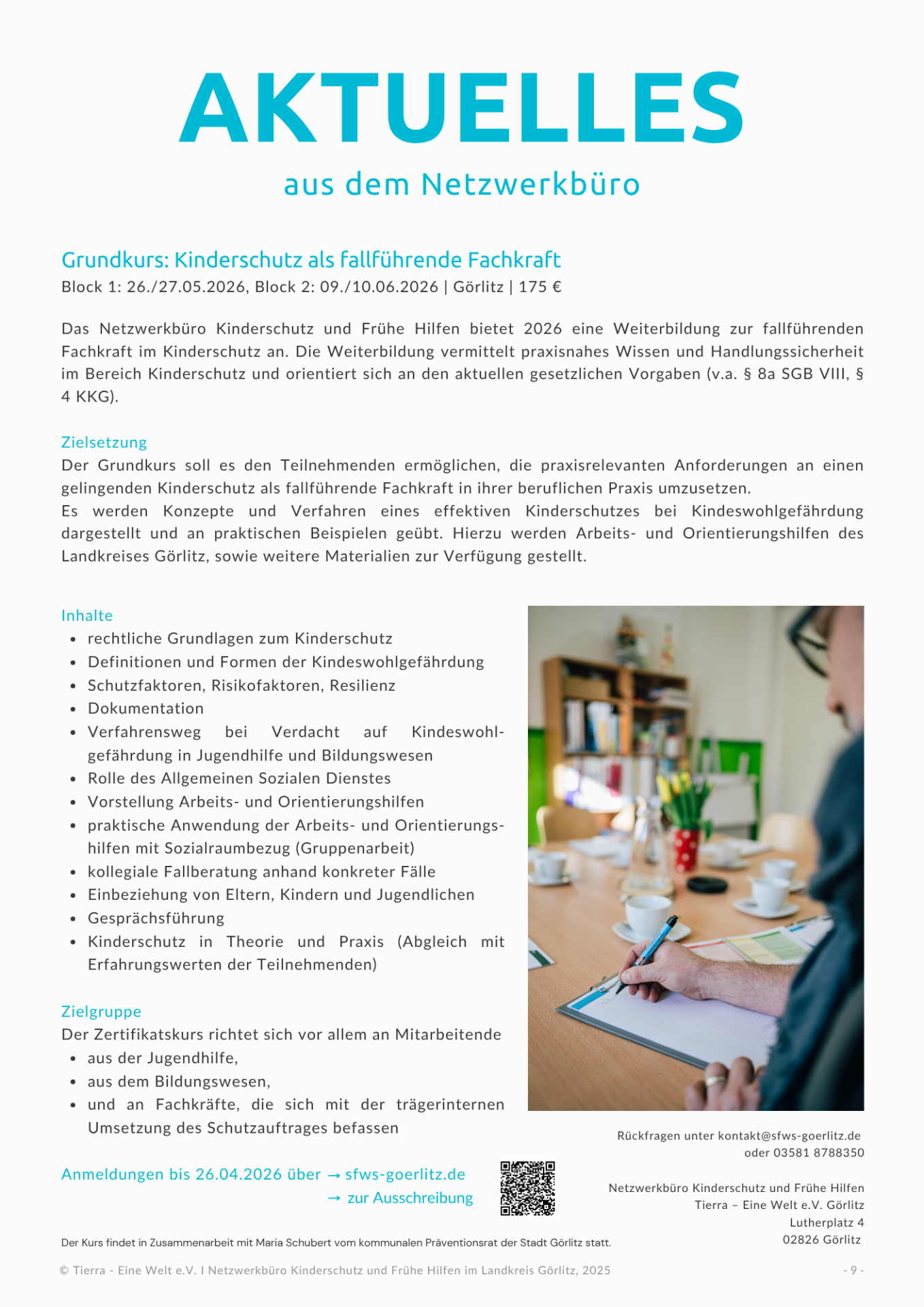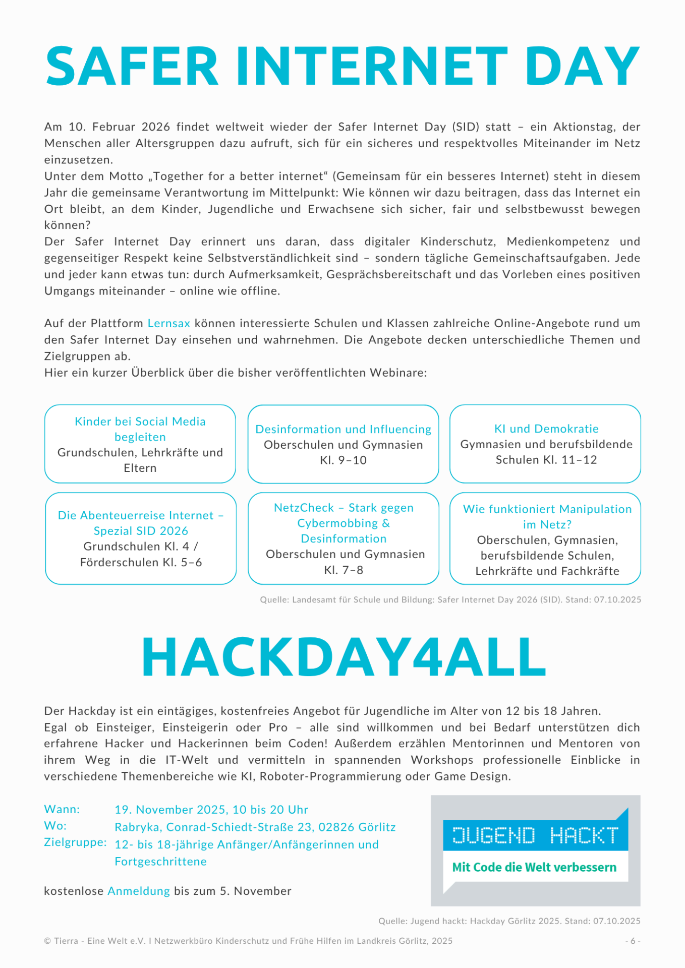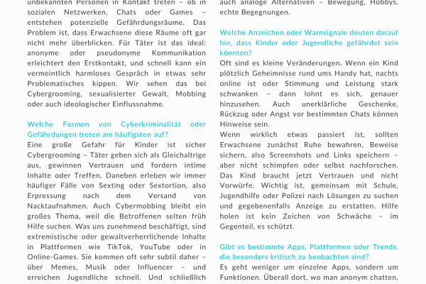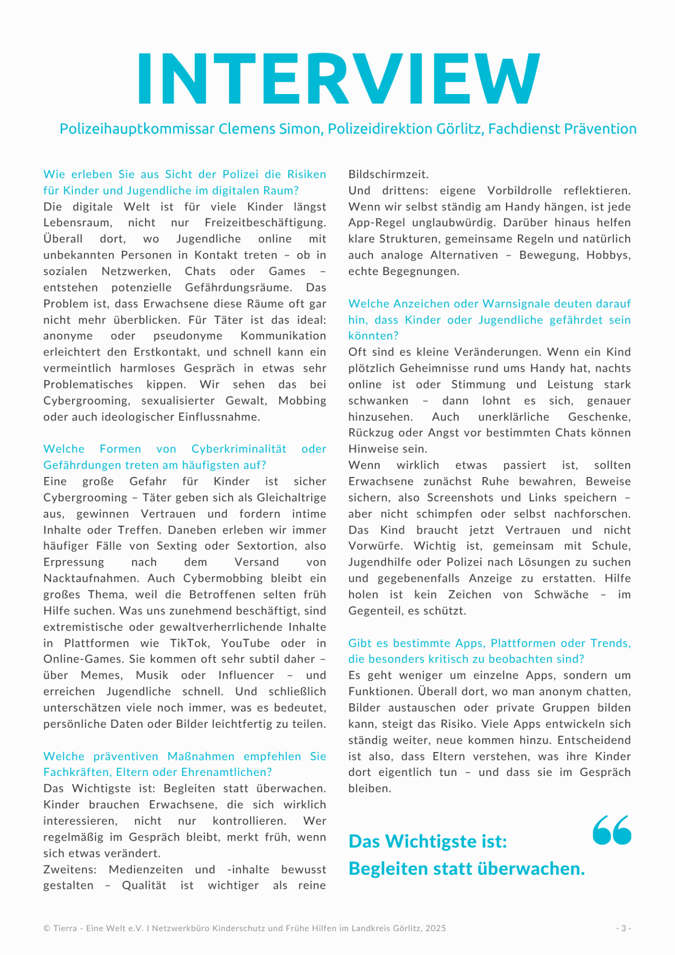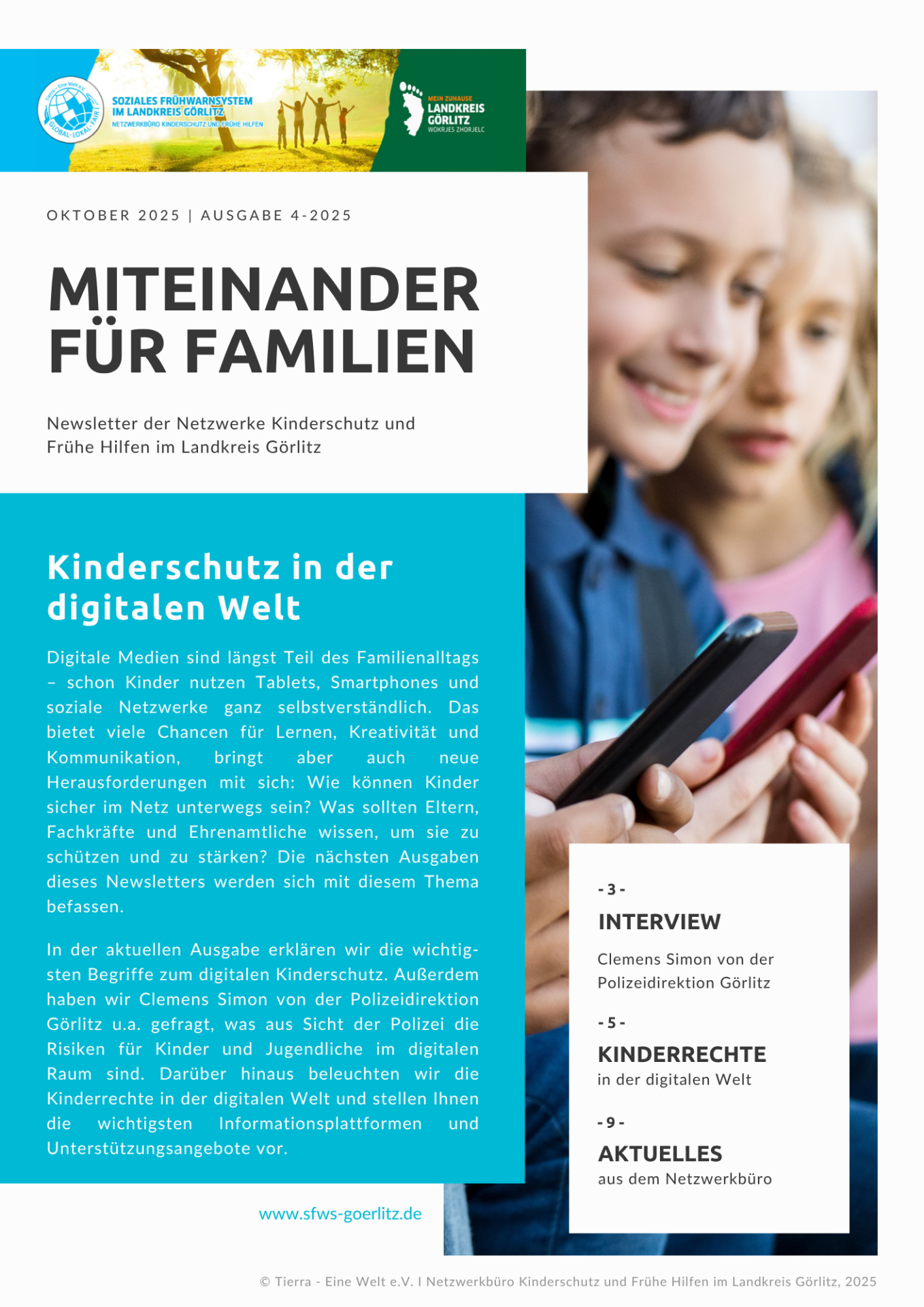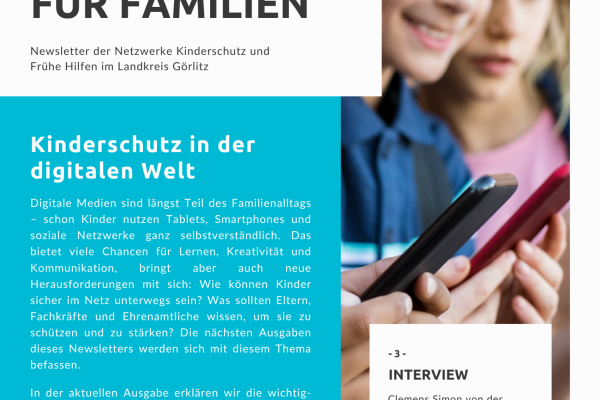In der aktuellen Ausgabe unseres Newsletters dreht sich alles um digitalen Kinderschutz. Wir erklären die wichtigsten Begriffe, geben Einblicke in die Risiken, denen Kinder und Jugendliche im Netz begegnen können, und berichten von einem Gespräch mit Clemens Simon von der Polizeidirektion Görlitz.